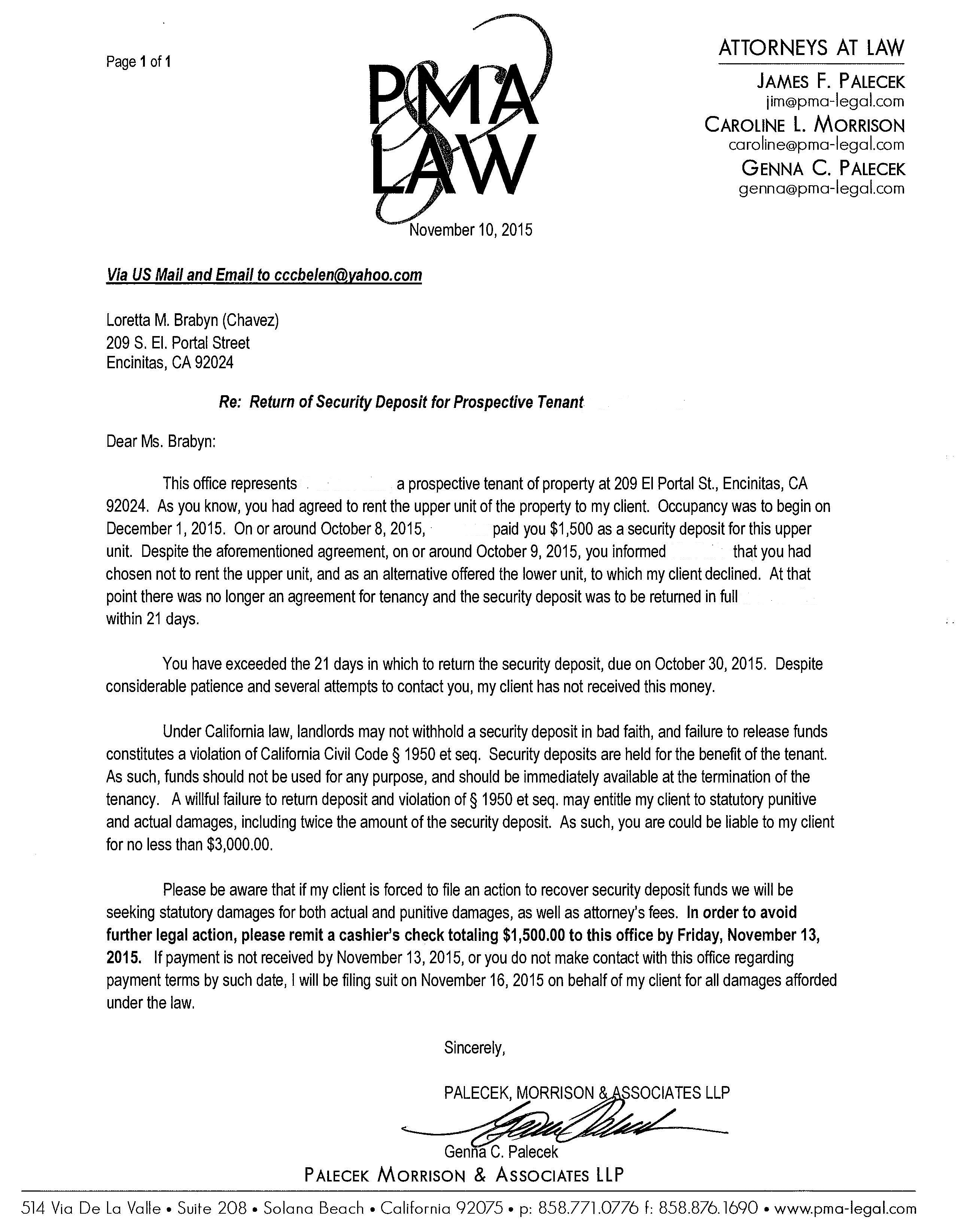 1. Ms. Loretta M. Brabyn (Chavez), the property owner enjoys unlawfully holding security deposit funds.